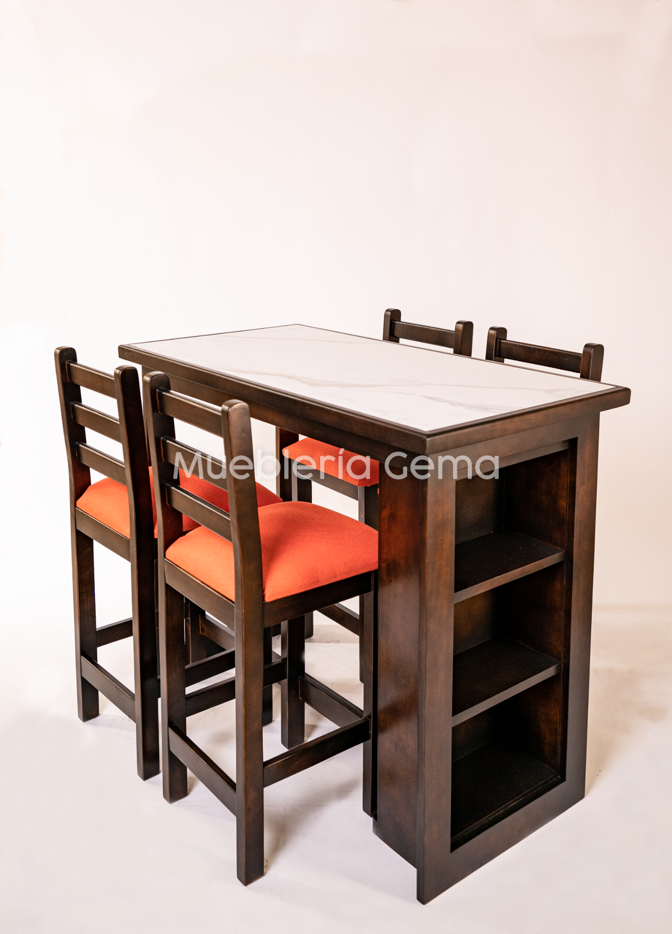 Moderno desayunador de 4 sillas en ciprés añejado, con sobre de porcelanato. Color de tapicería a elección del cliente.
